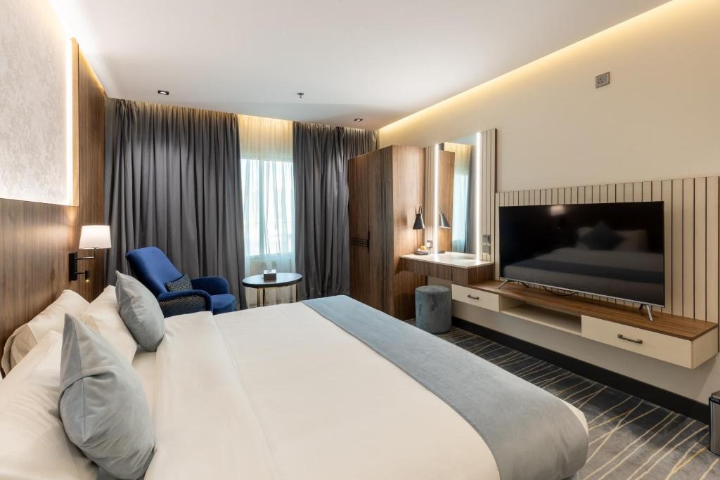 تفاصيل الغرفة Providing free toiletries and bathrobes, this double room includes a private bathroom with a walk-in shower, a bath and a bidet. The spacious air-conditioned double room provides a flat-screen TV with satellite channels, a private entrance, a tea and coffee maker, a wardrobe as well as city views. The unit offers 1 bed.