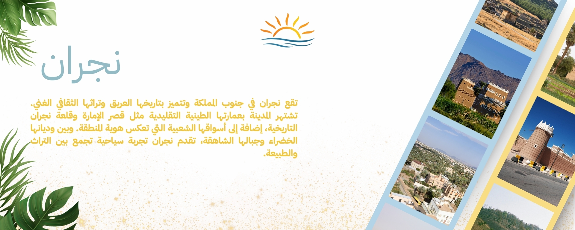 تقع نجران جنوب السعودية بين الجبال والصحراء والواحات، وهي مكان غنيٌّ بالثقافة والتاريخ، وقد كانت في الماضي محطة رئيسية على طريق البخور تمر عبرها القوافل التجارية، وموطناً للمجتمعات المسيحية واليهودية حتى ظهور الإسلام. حالياً تطورت المدينة حتى أضحت موقعاً سياحياً مميزاً لكافة المهتمين بإرثها الثقافي، ناهيك عن مناظرها الطبيعية الخلابة. تعمق أكثر في حضارة منطقة نجران وتاريخها من خلال التجول وسط مبانيها التاريخية وقصورها وقلاعها الشامخة؛ بدايةً من "قصر الإمارة التاريخي" الواقع في قلب المدينة، حتى "قصر العان" فوق جبل العان. يمكنك الاستمتاع بصور الفن الصخري الذي يرجع تاريخه لأكثر من 3000 عام في منطقة "حمى" الثقافية، وهي إحدى مواقع التراث العالمي لليونسكو. تتضمن المنطقة أكثر من 34 موقعًا؛ تصوِّر الحيوانات والنباتات وأساليب الحياة لثقافة امتدت على مدار 7 آلاف عام، وتعدّ من إحدى أكبر مجمعات الفن الصخري في العالم. لمعرفة المزيد عن تاريخ المنطقة، توجه إلى متحف نجران الإقليمي أو موقع الأخدود الأثري، موطن القطع الأثرية والرسومات والنقوش التي يعود تاريخها إلى أكثر من 2000 عام.
