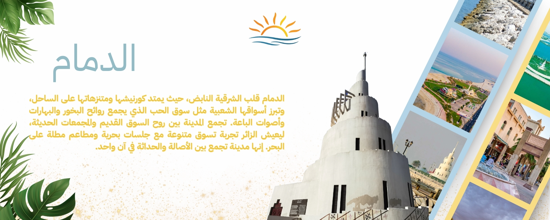 تجسد الدمام جوهر الحياة الساحلية، فهي مدينة الصباحات الهادئة والأمسيات المتلألئة. بشواطئها الهادئة ومطاعمها المحلية وروحها الفنية؛ تدعوك للتوقف والتواصل مع ذاتك ومن تحب. بوابة الجمال الساحلي الهادئ على الخليج العربي.