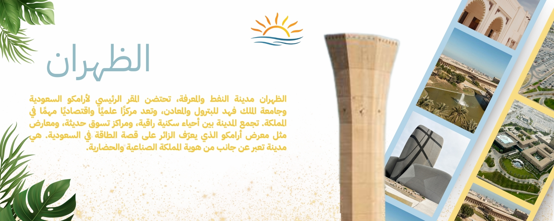 مقرّ مركز الملك عبدالعزيز الثقافي العالمي (إثراء)، رمز الثقافة والإبداع والابتكار، الذي يربط ظهران الماضي بالمستقبل. إنها مدينة تلهم الفضول، وتحتفي بالمعرفة، وتدعوك لرؤية السعودية من منظور الإبداع والتقدم.القلب الثقافي والفكري للمنطقة الشرقية.موطن “إثراء” الوجهة السعودية الأبرز للفن والمعرفة والابتكار.تضم مساحات خضراء ومتاحف ومعمارًا عصريًا في بيئة هادئة ومتأملة.مكان للتعلم والاستكشاف وتجربة نبض الإبداع الذي يشكّل مستقبل السعودية.