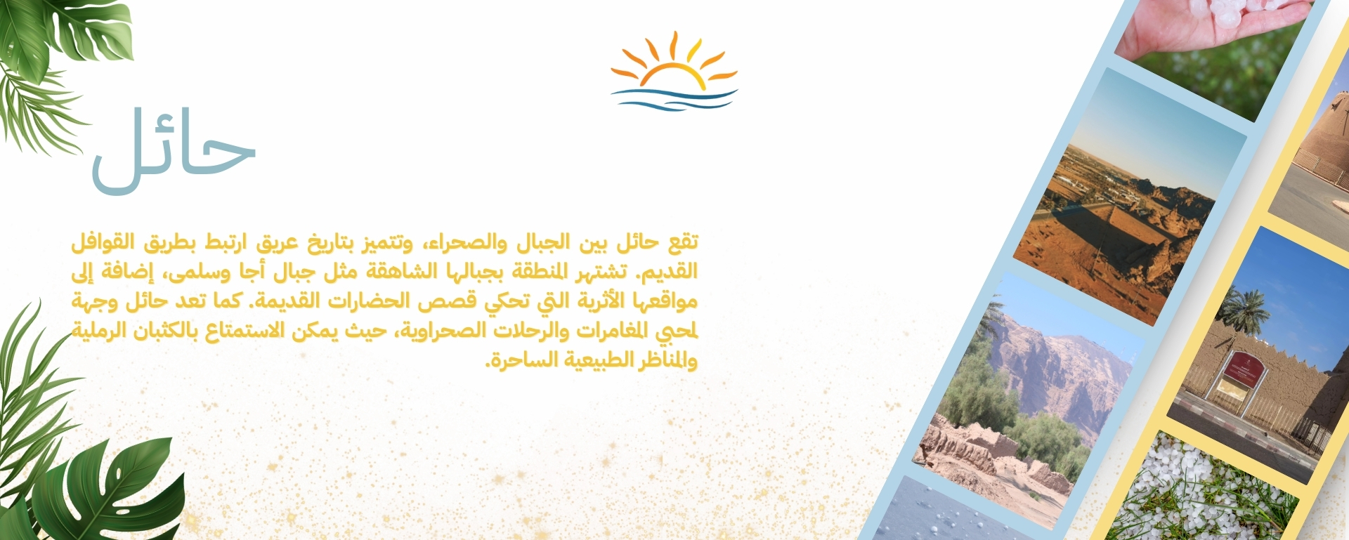 تشتهر مدينة حائل بالضيافة، والشعر، وروح المغامرة. كانت مركزًا رئيسيًا للقوافل والمستكشفين، ولا تزال تحتفي اليوم بنقوشها الصخرية، وحصونها، ومهرجاناتها التي تعكس ثقافة شمال المملكة. إنها وجهة سياحية في حائل تمزج بين التراث والراحة والدفء الأصيل.