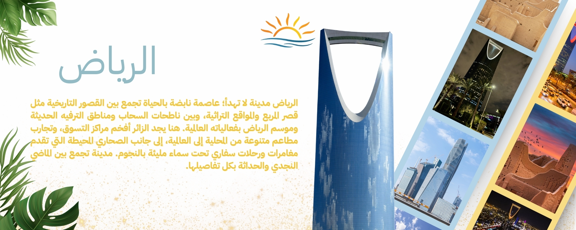 الرياض هي عاصمة المملكة العربية السعودية وقلبها الثقافي النابض، حيث يلتقي الابتكار الحديث بجذور التاريخ العريق. وتشتهر الرياض بمطاعمها الراقية ومراكز التسوق والترفيه العالمية، إضافة إلى معالمها التاريخية مثل قصر المصمك، والمتحف الوطني. وتتميز المدينة بأنها تجمع بين العمارة المستقبلية والتقليدية؛ مما يجعلها وجهة لا بد من زيارتها لكل مسافر.